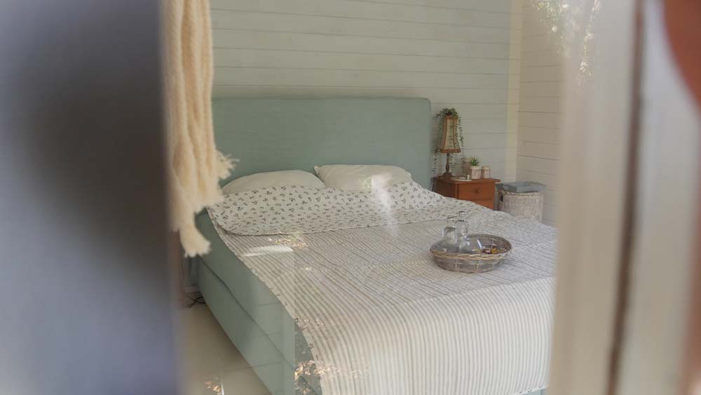 Has a lot of windows letting in lots of light and is surrounded by greenery with a cozy outdoor terrace. The room has a comfortable two-person boxpring bed. In the morning the sun rises right in front of your room, bringing in lots of daylight. Included: Towels, bedding, free Wi-Fi, electrical heating in winter, small plate of fruits, chocolates and two bottles of water.